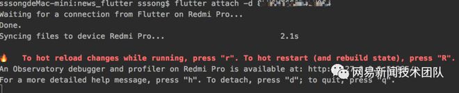 Flutter hot reload是Flutter的一大亮点,可称之为神器,合作开发人员有任何修改,都不需要重新启动应用领域,即可看到改动效果。进入Flutter module, 输入命令flutter attach。