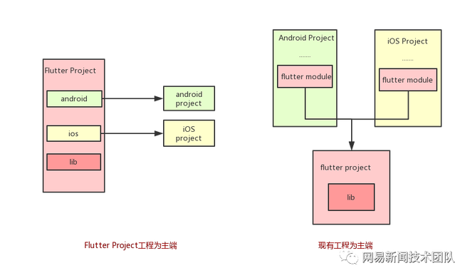 腾讯新闻报道采用上图右右图的形式,以原有工程建设为主端的Flutter Module的形式软件系统到原有工程中去,具体软件系统方法可参考https://github.com/flutter/flutter/wiki/Add-Flutter-to-existing-apps,合作开发人员在lib文件下采用Dart词汇撰写相应的业务标识符。
