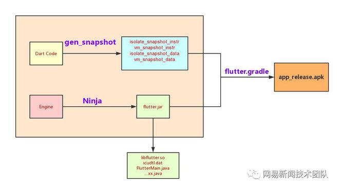 release商业模式下:Flutter的编译商业模式为AOT,业务Dart标识符直接生成二进制指令文件,如下表所示图右图,其中撰写的Dart标识符通过gen_snapshot编译器生成 vm/isolate_snapshot_data/instr,engine 通过Ninja 构筑系统来生成flutter.jar,包括了engine c++部份的标识符(flutter.jar中的libflutter.so),以及两套将Flutter嵌入Android的java类和接口(FlutterMain,FlutterView,FlutterNativeView等),最后通过gradle将这些Flutter有关标识符编译和嵌入到原生植物App中。