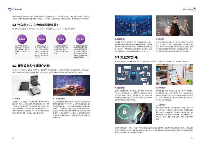 5G技术下,传统意义上信息的载体和传播媒介发生发生改变,信息将无须禁锢在屏幕中,今后身边的万物都可以成为承载信息的智能设备。折叠屏、可穿戴设备、VR等等将会更加宽广的领域进行应用。