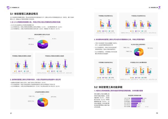 国内近四分之一的公司拥有新体验管理工作辅助工具,其中自研管理工作辅助工具的公司较多,大部分公司的新体验管理工作辅助工具只是停留在数据收集预测和展示层面,部分网络公司能够实现问题管理工作和预警机能。总体上来说,大型公司的新体验管理工作辅助工具机能丰富度高于中小型辅助工具。