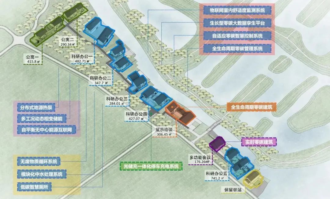 【事例】嘉善竹小汇零碳科创聚落一期项目。竹小汇零碳科创聚落(一期)位于浙江省嘉善县祥符荡科创中心核心区域,用地面积10404.38平方米,投资约1亿元,主要建设内容包括农房改造、景观绿化、市政配套,以及地源热泵系统、中水处理站、储能充电桩等低碳设施等。该项目按照绿色自然生态建筑三星标准建设,注重建筑节能,着力打造首个“近零碳”技术创新聚落样板,设计上,应用多项零碳和无废技术,建设中积极应用数字智慧化管理工作运营平台系统以及新工艺新技术,力争形成可示范、可复制推展的实战经验。