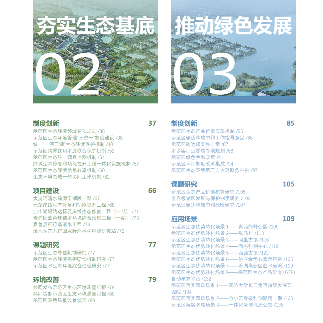 示范园区已经吸引了华为青浦研发中心、复旦大学技术创新学院、浙江大学智慧绿洲、同济大学可稳步发展研究院等一批技术创新研发高等级平台、项目落户,绿色自然生态技术创新融合发展能级效应正不断放大。随着《示范园区碳达峰实施计划》《水乡客厅近零碳专项规划》《示范园区建立健全自然生态产品价值实现监督机制实施计划》相继正式发布,上海青西郊野公园、溧阳善湾村“曲水善湾”项目、嘉善姚庄绿色自然生态共富示范带、嘉善竹小汇零碳科创聚落等一批代表性样板项目建成运营,示范园区打造自然生态优势转化新标杆、绿色自然生态技术创新发展新高地、人与自然和谐宜居新典范的感受度正变得越来越强。