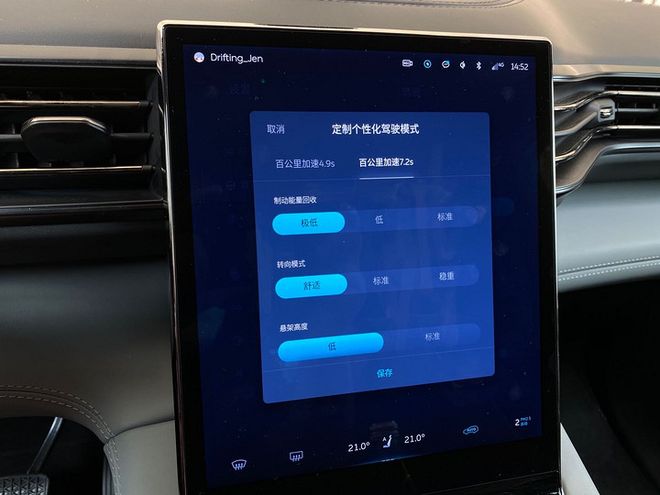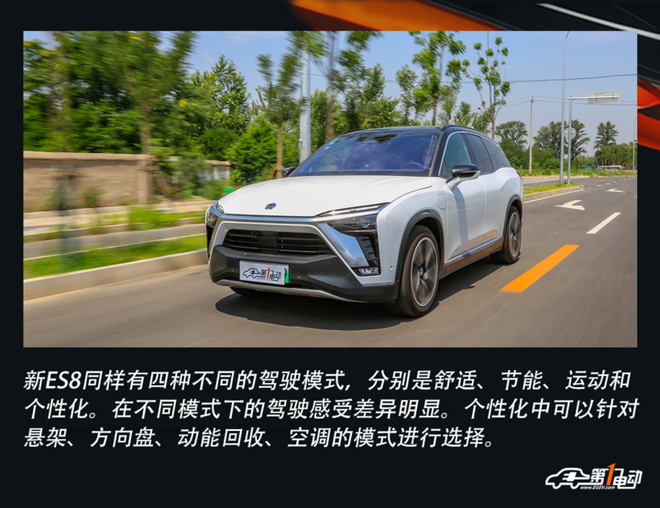 在定制个人化驾车模式中,蔚来ES8的可操作性非常高。包括动能回收、转向模式、悬架高度及刚性以及空调模式等等,而且这些模式并不是摆设,新体验区别却是很明显的,每个人在个人化驾车模式中都能找到适合自己的驾车体会。