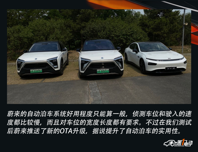 自动泊车这里他们吐槽两句,就是这个速率太慢,识别度也不算高。另外最重要的一点,就是这个全景影像的摄像头,畸变非常严重,感觉给驾车员参考的意义并不大。不过据说蔚来在他们试验后面世了OTA升级换代,升级换代中就包括了自动泊车,将易用性提升了不少。