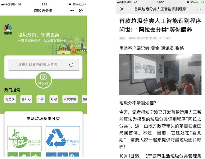 2019年10 月1日起《嘉兴市生活垃圾分类管理条例》正式施行,嘉兴市生活垃圾分类指导中心联合嘉兴市大统计数据产业发展管理局和宁波工程建设学院统计数据工程建设中心师生,研发基于人工智能算法为基础的垃圾分类识别小程序——“阿拉去分类”。