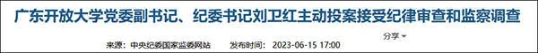 广东开放理工学院党委副书记、纪检书记刘卫红主动投案拒绝接受党纪审核和稽查进行调查