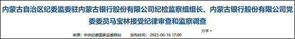 呼伦贝尔市纪检稽查委员驻内蒙古商业银行股权股权有限公司纪检稽查室秘书长、内蒙古商业银行股权股权有限公司党委书记马常青拒绝接受党纪审核和稽查进行调查