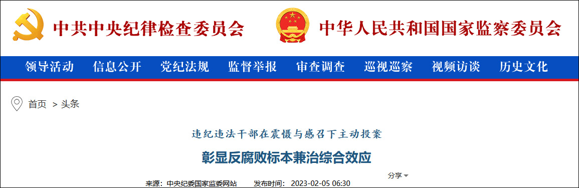 2月5日,中央纪委北欧国家监察委员中文网站发表文章《受贿违规干部职工在威慑与救世下积极主动自首 彰显反腐双管齐下综合性负面效应》,以下为文章全文: