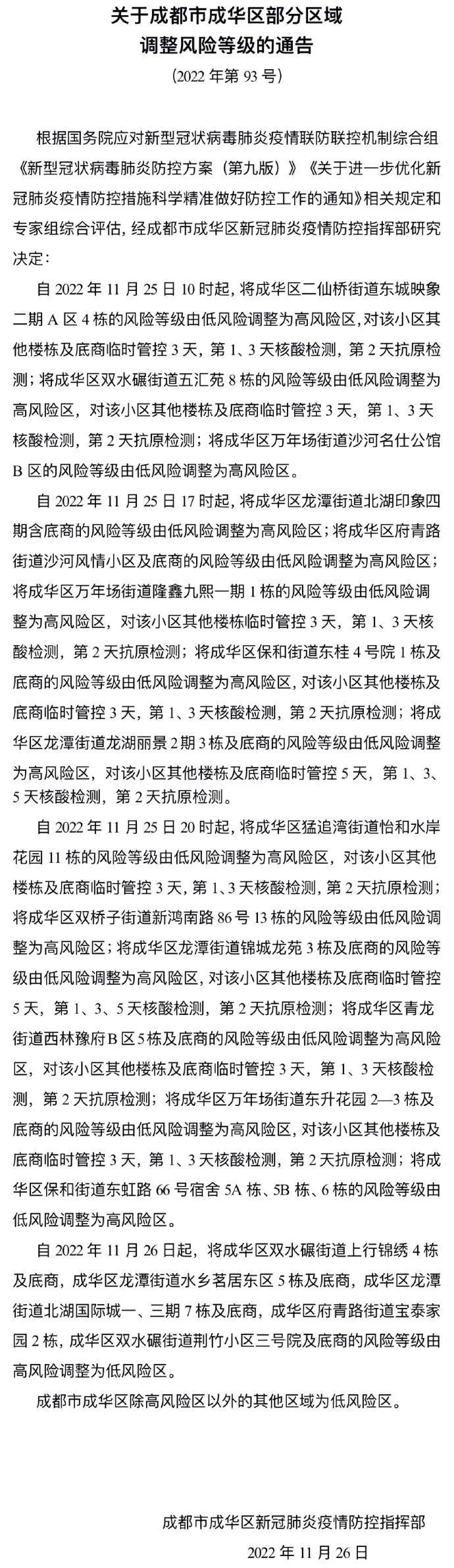 一、自2022年11月25日起,将武侯区望江路街道望江路1号中海格林威治城7栋、武侯区浆洗街街道红牌楼北街23号5栋(含底商)、武侯区红牌楼街道双丰路38号双丰小区2栋、武侯区红牌楼街道佳灵路9号乐乎城市青年社区(红牌楼店)、武侯区火车南站街道新光路1号观南上域·瑞苑2栋、武侯区红牌楼街道逸霞街9号圣沅汇景新村7栋、武侯区望江路街道郭家桥北街10号院4栋、武侯区火车南站街道长寿苑5号院30栋、武侯区机投桥街道九金街86号半边街新居B区6栋调整为高风险区;同时对武侯区望江路街道望江路1号中海格林威治城除7栋以外的楼栋,武侯区浆洗街街道红牌楼北街23号除5栋以外的楼栋、武侯区红牌楼街道双丰路38号双丰小区除2栋以外的楼栋,武侯区火车南站街道新光路1号观南上域·瑞苑除2栋以外的楼栋,武侯区红牌楼街道逸霞街9号圣沅汇景新村除7栋以外的楼栋、武侯区望江路街道郭家桥北街10号院除4栋以外的楼栋、武侯区火车南站街道长寿苑5号院除30栋以外的楼栋、武侯区机投桥街道九金街86号半边街新居B区除6栋以外的楼栋(含底商)、武侯区望江路街道一环路南一段12号学府花园锦学阁临时管控3天,实施3天3检。