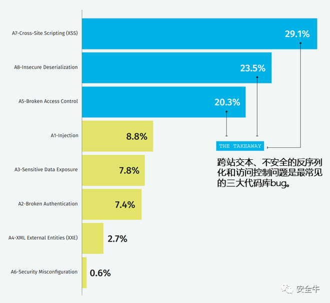 调查报告还发现跨站点脚本(XSS)是开放源码库中最常见的安全可靠漏洞类别,占比接近30%其次是不安全可靠的反序列化(23.5%)和访问控制入侵(20.3%),如右图所示: