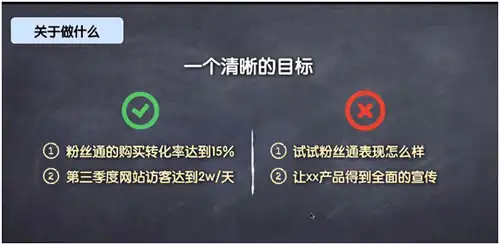 他们看看,左侧是2个清晰的计划最终目标,(粉丝通的购买转化率应达到15%,这个最终目标前要加个时间点,他们就说8月份吧)有时间点,有具体内容的结果。而右侧则是2个含糊不清的最终目标,比如说让xx产品得到全面的宣传,甚么叫全面的?答甚么叫全面的?如果是这样的两个含糊的最终目标,我又是不是去分解这样的两个最终目标呢?分解我的组织工作步骤呢?根本就无法分解,所以就导致你做的每一件事情都没目的性。