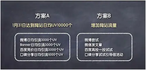 这是两个不同的计划:计划A与计划B ,计划A 的最终目标是1月31日达到中文网站日均UV(独立访客)1000个这是两个明晰的最终目标,有时间线,有可测量的数字结果。计划B的最终目标是增加中文网站互联网流量,这是两个不合格的最终目标。
