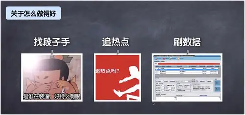 误区一:找段子手 段子手看似那时很红火,只不过最红火的时间应该是在2015年,2016年段子手这个行业的生意已经没那么好了,但是那时还有很多人去找段子手,认为段子手的影响力很大,去写两个漫画或者是两个有意思的东西,然后投放到市场,让一些微博大V去转发,认为这个是营销的成功。但是所转发的统计数据和你的产品销售业务转化有关系吗?带来了真正的转化了吗?