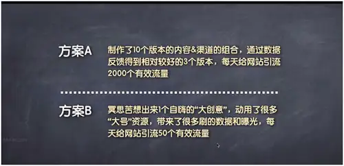 这两个计划,哪个更好。大家一看就能选出。再强调一次,创意只是营销或者计划的一部分,你需要制作很多很多的创意,然后通过统计数据测试,去找到比较好的那两个。或者说,你一开始可以不必要把创意做得那么好,你只是有两个想法,然后快速的去测试,如果这个想法足够好,这时你把去把这个想法做得精品起来,让它成为两个好的创意。