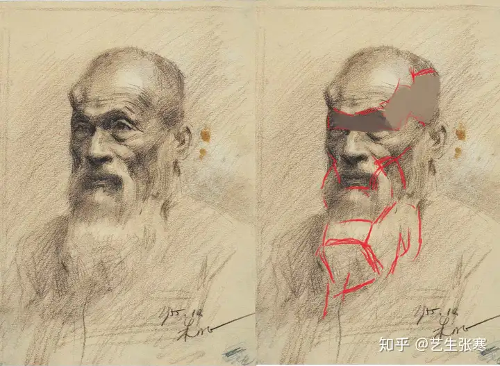 我们可以看见作者用最符合图画本质要求的方式去解析和表达了这个头像题材。 其实不管是画两个果子,还是画两个头像,还是画一捋胡子,无非都是用结构分面、明暗准确表达基本形貌内部空间关系。