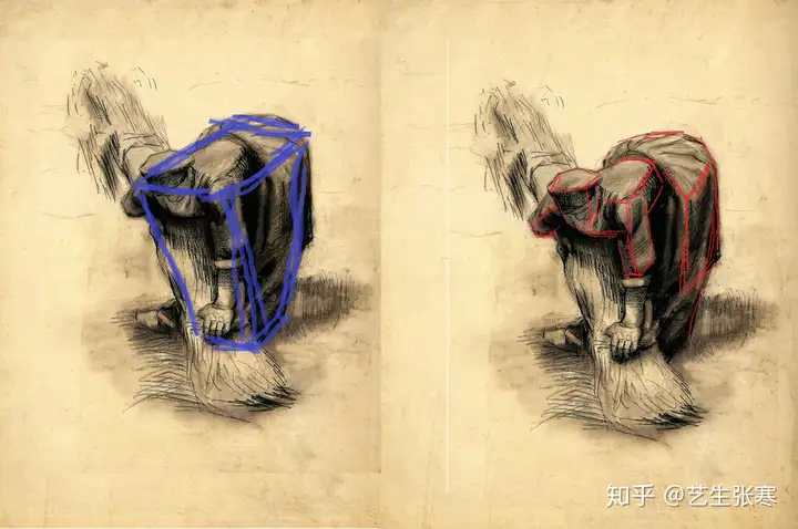 近和远,骨和肉,方和圆,轮廓的前和后,左图中都有明显的差异,而右图不管是从手法上还是从结果上看,都一样。