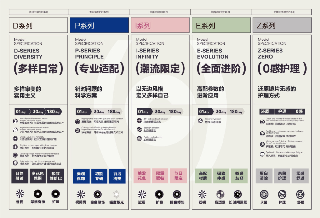 这样全新的划分模式,不是按照传统的白片或者彩片来划,是按照用的使用习惯,和日常配戴市场需求来去做划分的,每一个系列恰好满足了相同的使用者的日常配戴市场需求。