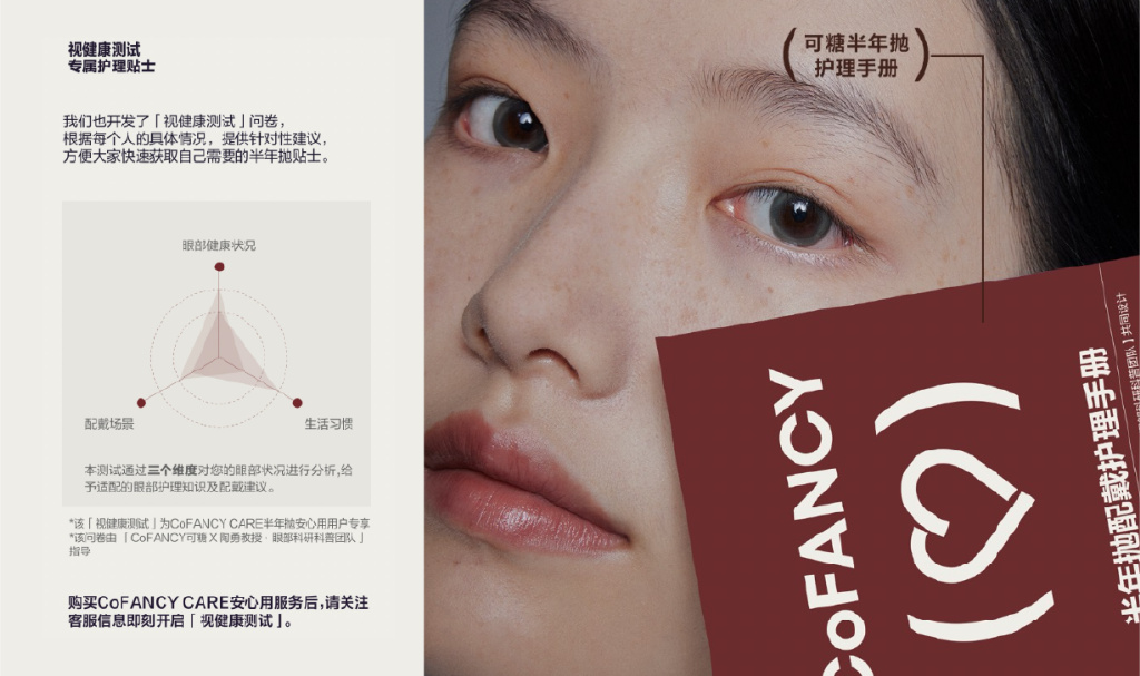 其次,因洞察到长期抛使用者普遍出现保健问题,可糖为此推出了cofancy care半年抛商品的安心用服务,可糖会提供线上眼周速测服务,针对性地进行商品种类配戴/养护教育及商品推荐,还会提供180天无理由兑换1只镜片的保险服务,且会不定期对服务追踪,提供更定制化的关怀。