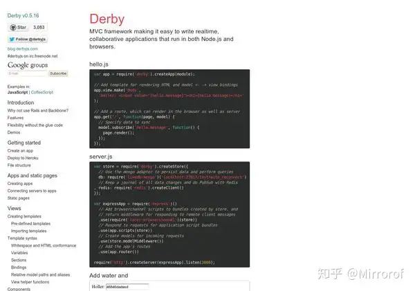 Derby是两个MVC架构,帮助编写动态,交互的应用领域。能运行在Node.js或是浏览器环境中。还保有两个数据同步引擎Racer。所推荐两个自学资源给我们:Node.js MVC:Express.js+Derby.js Hello World讲义(https://webapplog.com/node-js-mvc-express-js-derby-hello-world-tutorial/)。
