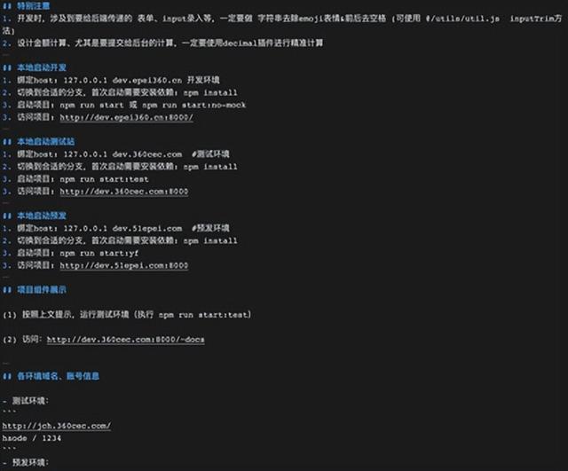 工程项目开启对于新入职员工,以及新人还是有一定的挑战的,特别是许多工程项目须要配置相关的host,package.json文档里头一般只是基础的开启,不会提示配置host等,此时就须要他们制定一个规范化,比如在README.md文档下写上具体的开启步骤,以及每一环境须要配置的host,具体如下: