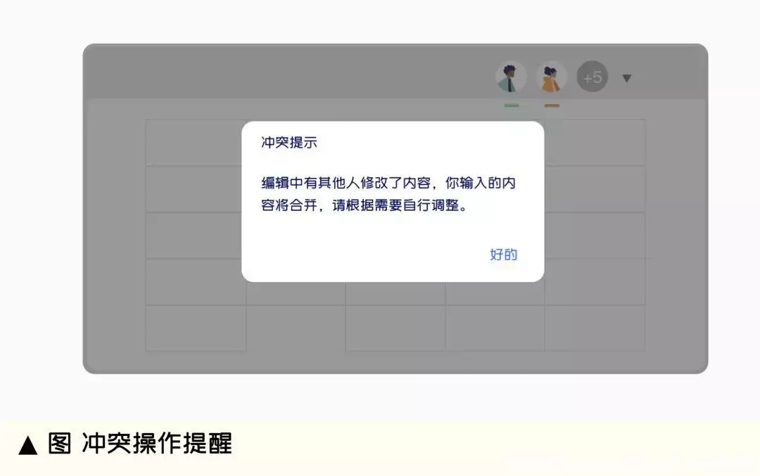 02 互不干扰性王承恩协同时,存在操作方式互相干扰的可能性。对比操作方式后内容的丢失,他们须要提前防止操作方式的干扰给采用者带来损失,尽可能确保采用者在组织工作介面操作方式的专注性和操作方式冲突的可扩展性。多个采用者同时撰稿同一个个内容时,可能会出现操作方式的冲突,他们须要明确地给采用者提示正在冲突操作方式,透过合理的布局提示、引导信息信息展示,甚至可以为采用者提供冲突后的解决方案或者容错提示,帮助采用者快速了解冲突的情况,做出正确的操作方式选择。
