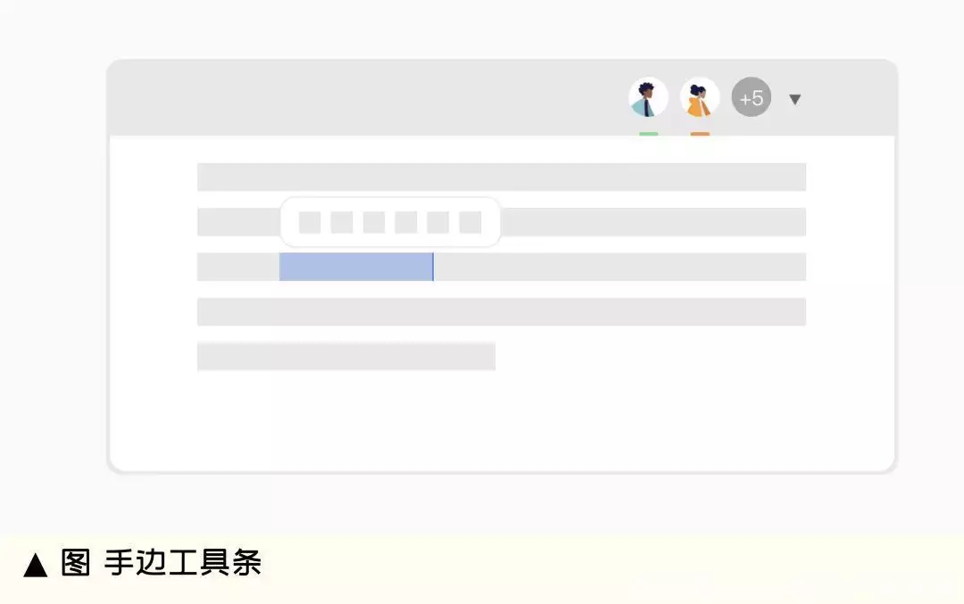 除了采用者熟悉且固定位置的辅助工具,还有须要很多轻量便捷的手边辅助工具。手边辅助工具不须要采用者移动很远的位置进行辅助工具的查找,即能为采用者提供轻量便捷的操作方式。例如:在撰稿状况下的选中文本,预判采用者可能会进行文字、格式等撰稿的操作方式。