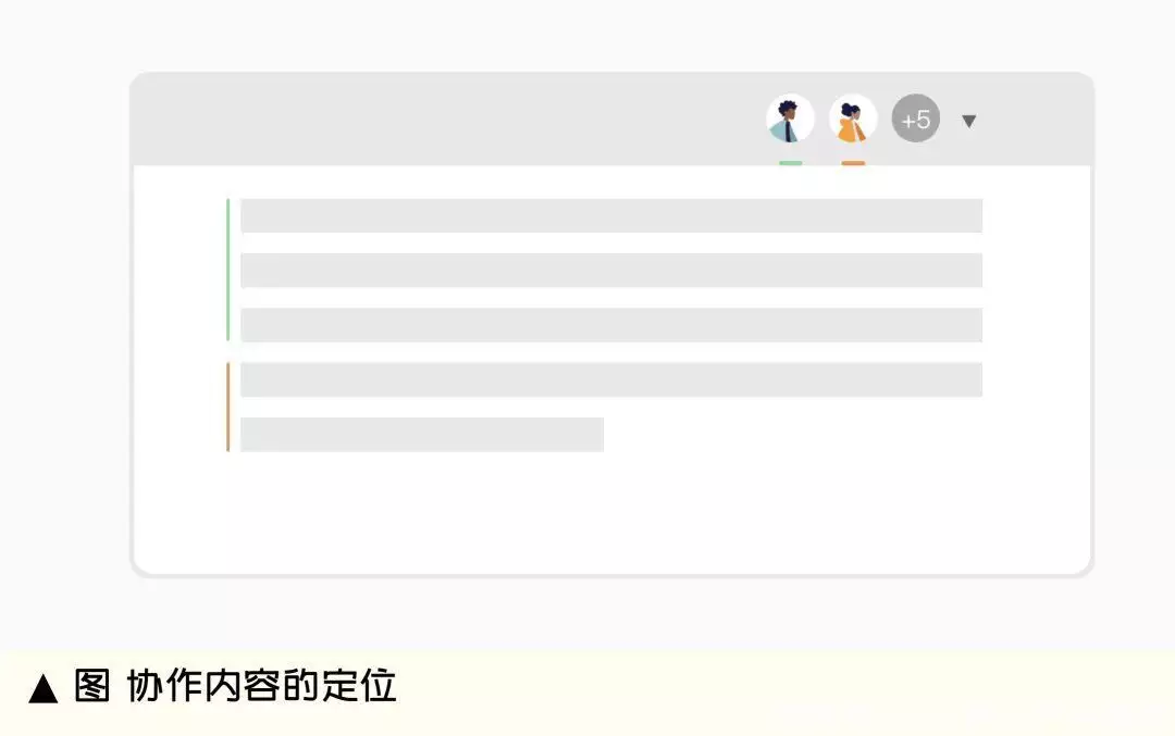 对于协同人共同产出的内容,须要采用者快速分辨出哪些部分是谁产出的,须要对协同人的操作方式位置、操作方式内容进行定位和查找,才能达成一致高效协同的目标。可以采用颜色标记或动态图标等方式,突出显示正在撰稿的地区。同样,内容和位置的定位也可以透过结构设计进行可视化来帮助采用者在组织工作介面内将“内容”与“人”进行关联,突出显示正在撰稿、已顺利完成撰稿的地区。