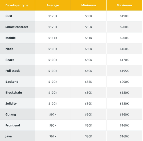 你的经验、C语言科学知识和资历会影响你的薪资。下图显示了各种职位或合作开发人员类型的平均、最低和最高年薪。人们可以在cryptojobs.co、Indeed.com 和web3.career的 Web3 空间中寻找此类机会。