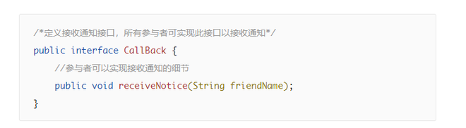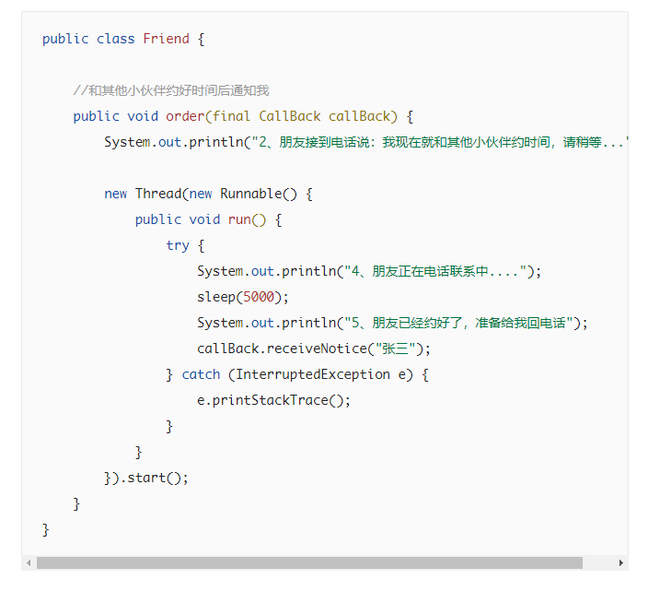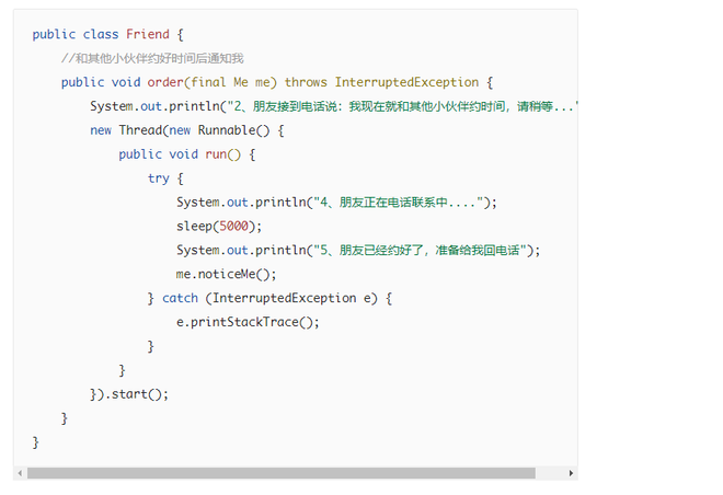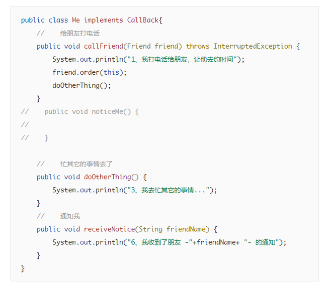 从主程序可以看出,只有我初始化了callFriend(),朋友怎么沟通交流、怎么回电话,我都不关注,他只需要持有“我”对象的引用就行了,需要通知我时,就通过引用初始化noticeMe()。