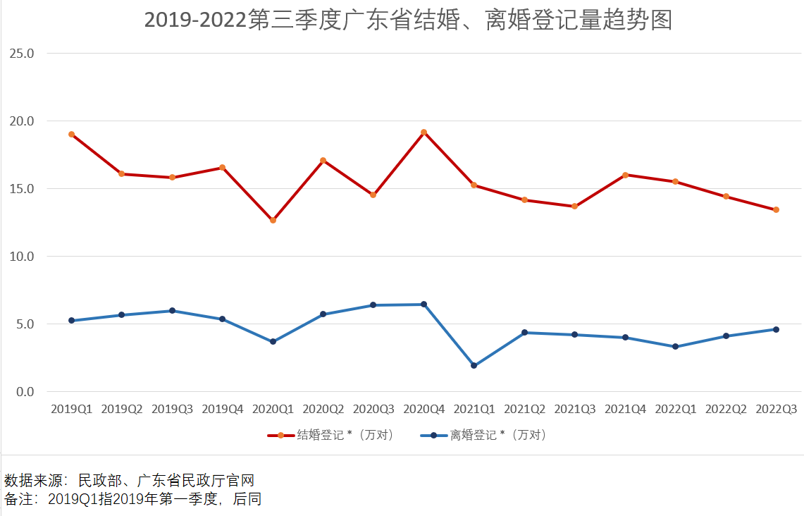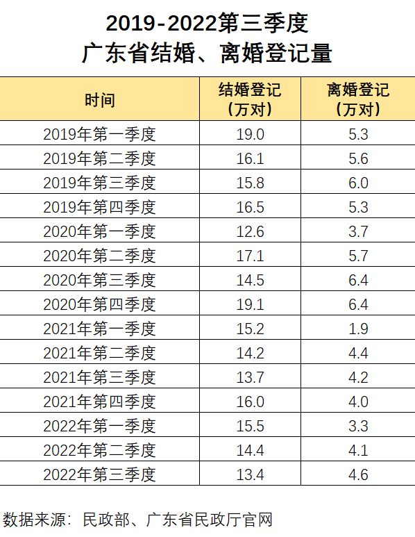 根据统计数据统计,近几年,我国的成婚人数急速下降,成婚率急速减少。以广东为例,2019年成婚登记之积67.45万对,2020年成婚登记之积63.33万对,2021年成婚登记之积59.1万对。