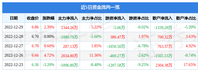 12月29日的资本金流入统计数据方面,主力部队资本金净流出1344.26多万元,占总成交金额5.22%,主力资金资本金净流出5.06多万元,占总成交金额0.02%,中小型散户资本金净流出1339.2多万元,占总成交金额5.2%。