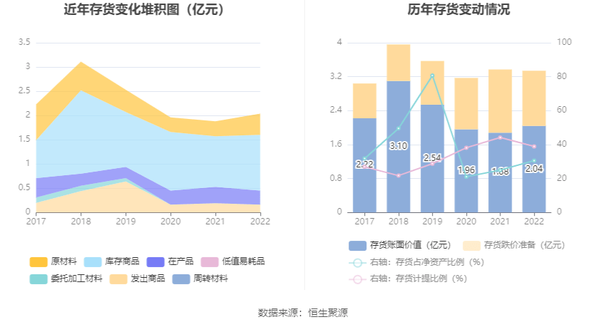 从存货变动上看,截止2022年初,子公司存货账面价值为2.04亿,占净利润的30.58%,较去年前两年初增加1595.14多万元。其中,存货跌价准备为1.3亿,计提比例为38.9%。
