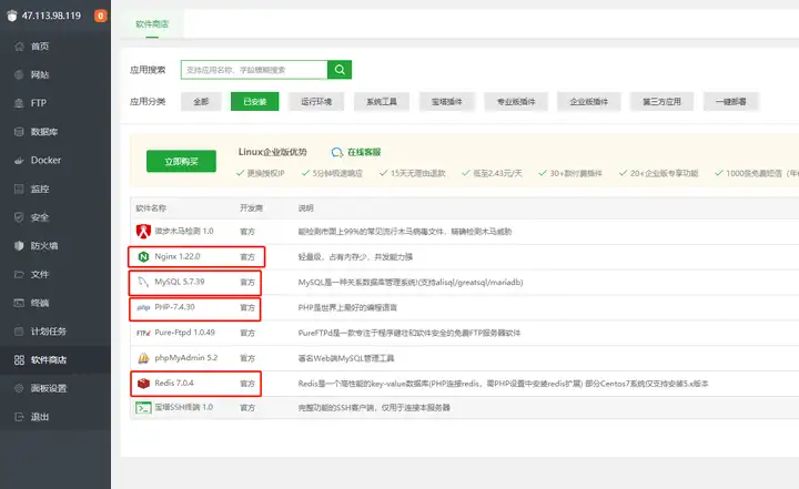 nginx-1.20+mysql-5.7 (要优先选择5.7)php-7.4 (要优先选择7.4)redis-7.0+等候加装顺利完成,大体须要几秒钟左右。