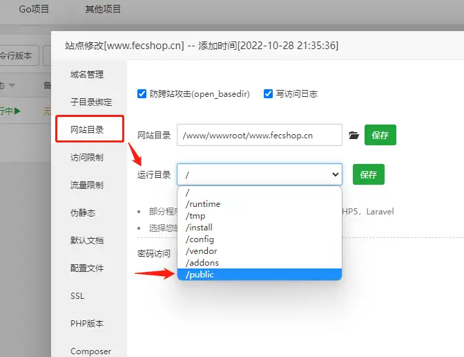 点选中文网站目录,运行目录勾选public,勾选后,点选保存按键