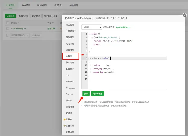 点选左侧栏伪静态, 将下面的代码拷贝进去,点选保存按键即可