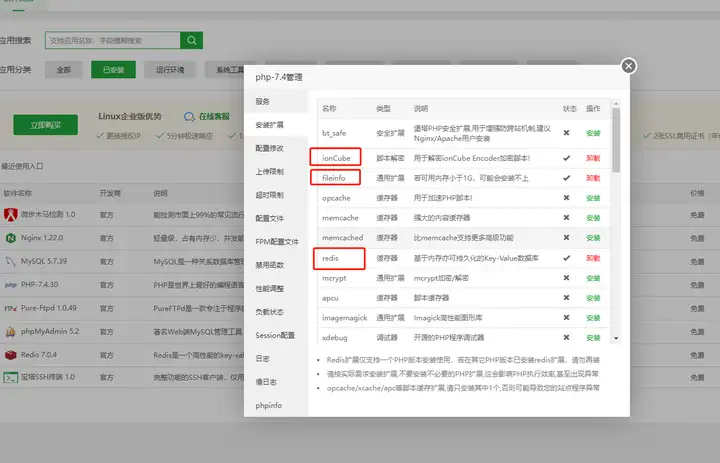 加装php扩展: ionCube,fileinfo,redis