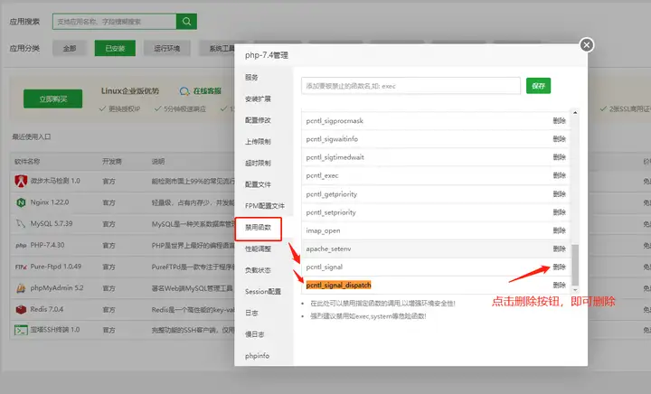 须要删除以下的php禁用函数: