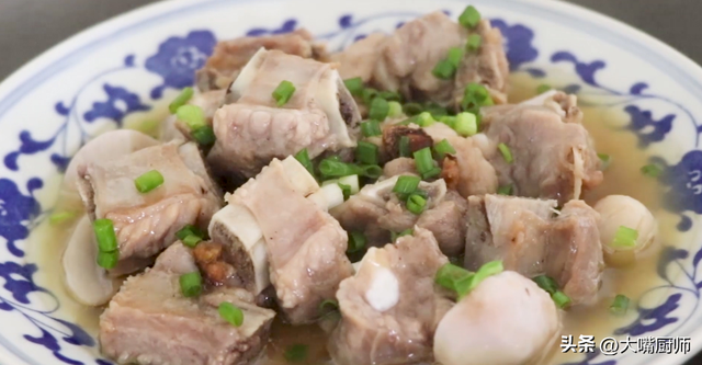 3、把芋头块铺在盘子里,腌好的排骨块放在芋头上,淋上适量油,盖上一个盘子,放进蒸锅里隔水蒸40两分钟,出锅后撒上葱花即可。