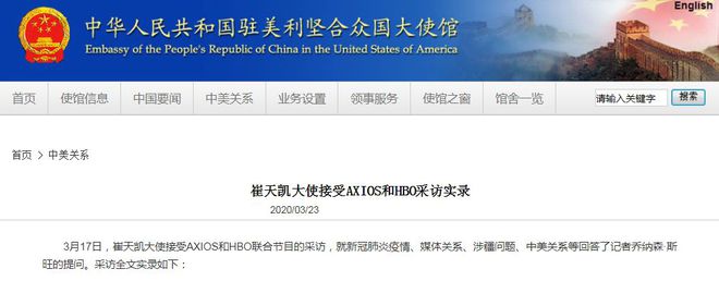 3月17日,中国驻美大使崔天凯接受AXIOS和HBO联合节目的采访,就新冠肺炎疫情、媒体关系、涉疆问题、中美关系等回答了记者乔纳森·斯旺的提问。采访全文实录如下: