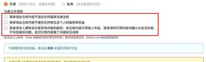 其实,我们可以仔细分一下为什么碍于无可奈何?我关上 Gitee ,登录我的账号后,我将我的开放源码工程项目准备设成申明的时候,会有如下提示: