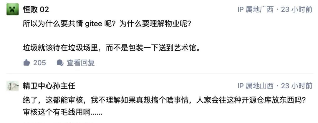 反倒,其实,我倒是有点同情 Gitee 平台了,在他们发展还不错的情况下,被那么一搞,这发展势头就没了。当然了,有了 Gitee 这种前车之鉴后,我认为未来在国内也没有其他公司或是平台来做这种开放源码社区了,整件事,对于国内他们搞开放源码社区或是开放源码生态损害挺大的。