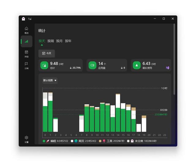 门牌号:github.com/veler/DevToys6、Tai:Windows 上统计软件使用时长的辅助工具。该工程项目会根据软件获得焦点和失去焦点的时间差,来计算软件的真实使用时长,而不是简单地统计软件存活时间。