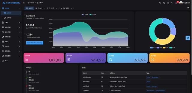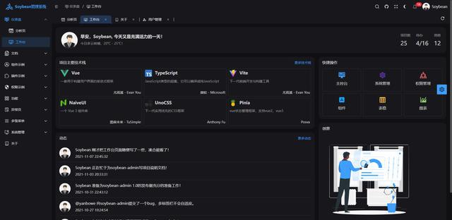 Soybean Admin 是两个如前所述 Vue3、Vite3、TypeScript、NaiveUI、Pinia 和 UnoCSS 的清爽典雅的中前台模板,它采用了新一代的后端控制技术栈,内建多样的主轴实用性,有著很高的标识符规范化,如前所述 mock 同时实现的静态职权路由器,照相狸尾豆的中前台后端软件系统,也可用作自学参照。