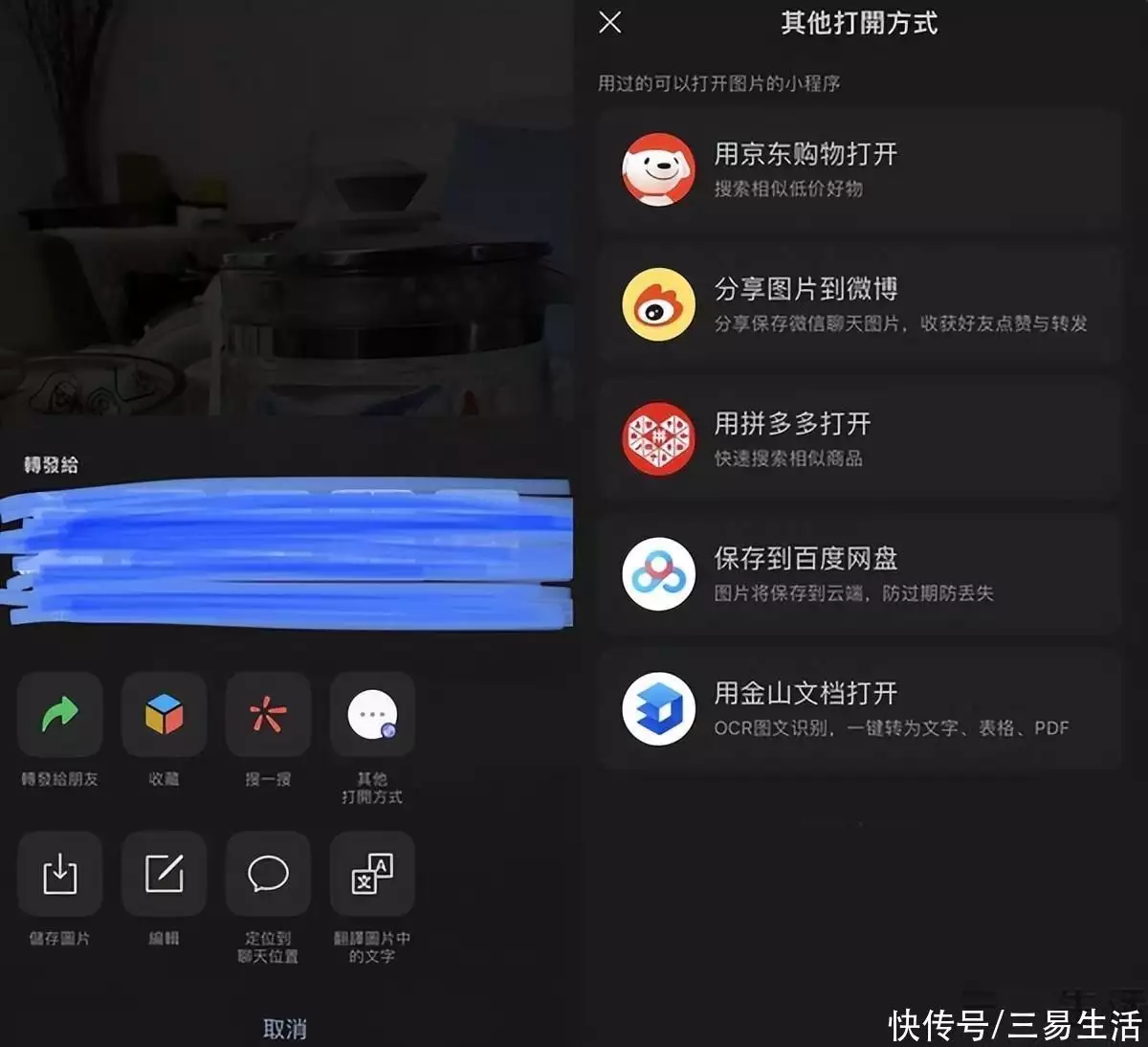 除了合作开发网络平台外,近期有用户反馈,只需长按聊天窗口中的图片就会出现新增的“更多打开方式”选项,点击后即可通过不同的小流程打开图片,不过暂时仅全力支持用户已经采用过的小流程。比如在拼多多、京东等电商网络平台里搜索图片里的同款商品,在微博发送相应的图片内容等。