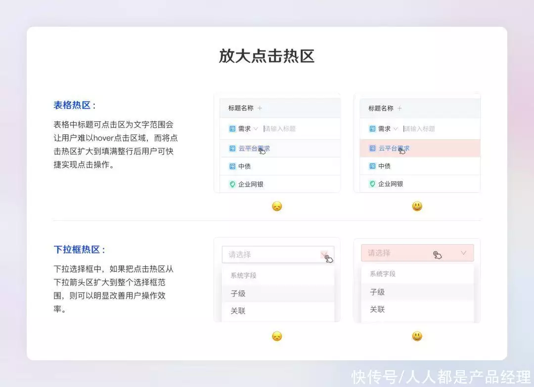 放大可点击按钮热区,相对于较小点击热区,具有更丝滑操作体验。