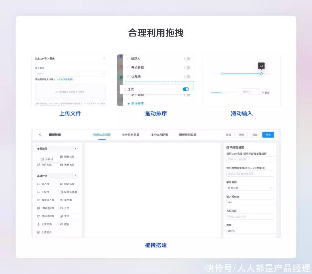 在涉及到诸如上传文件,排序,滑动输入,构筑等需求时,合理采用拖拽可视化常常可以打造更加便捷用户体验。