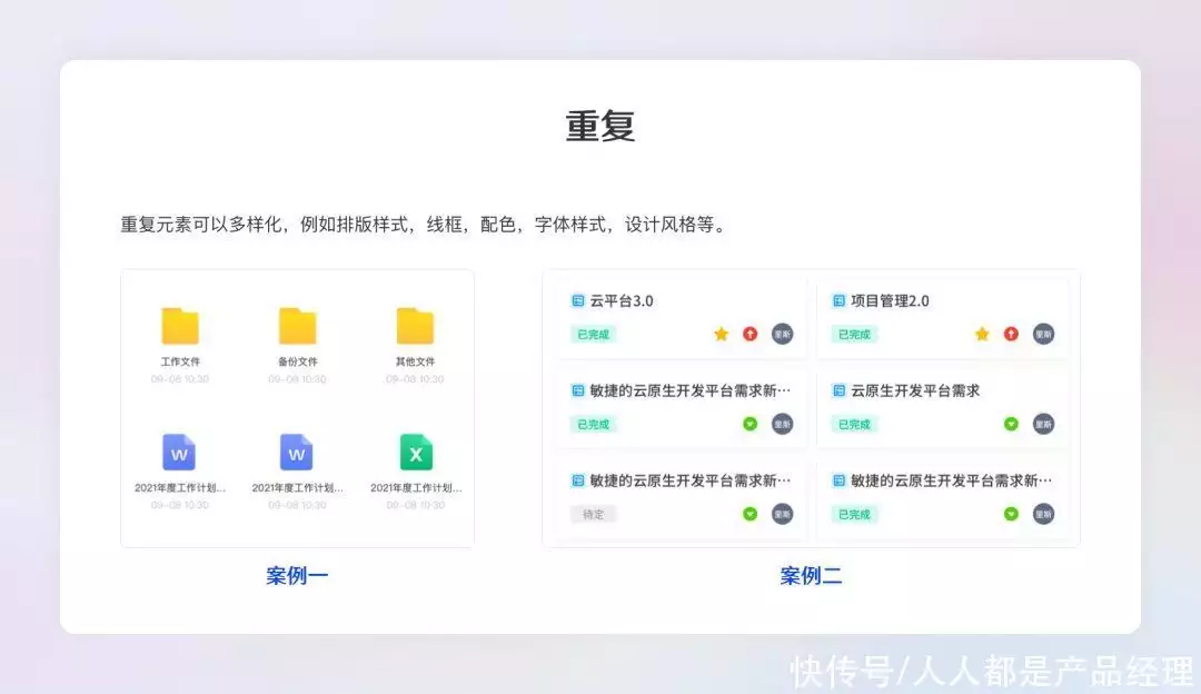 重复是指相同的元素在项目中重复引用,促进作用是可以有效降低用户的学习成本,同时提高这些元素之间的关联性。