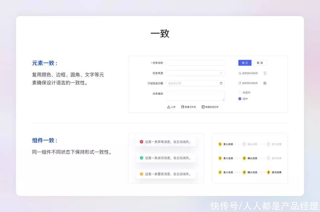 一致性是指在不同网页中相同操作应保持一致视觉与可视化样式,可有降低用户学习成本与企业开发成本。